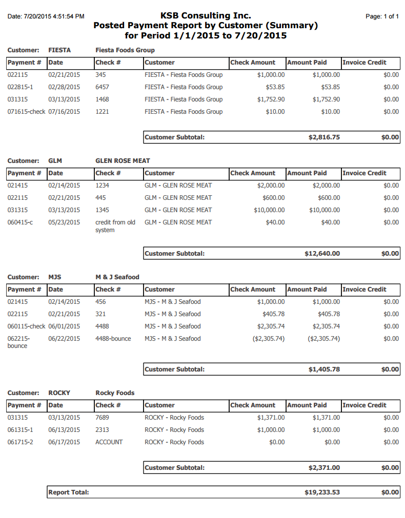 The purpose of this function is to print out a summarized payment report sorted by customer code.